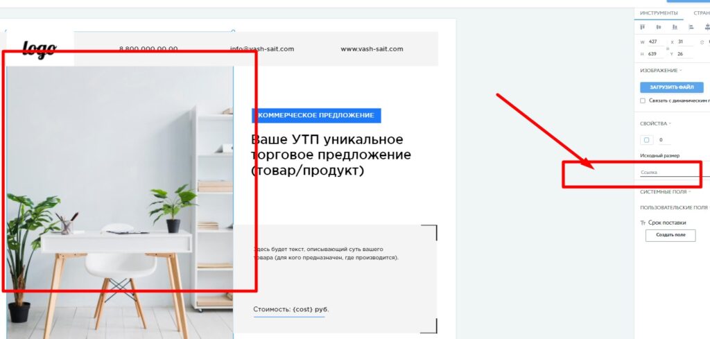 Чтобы сделать картинку кликабельной, кликните на нее 1 раз левой кнопкой мыши и добавьте ссылку (например, на сайт) в окошке справа.