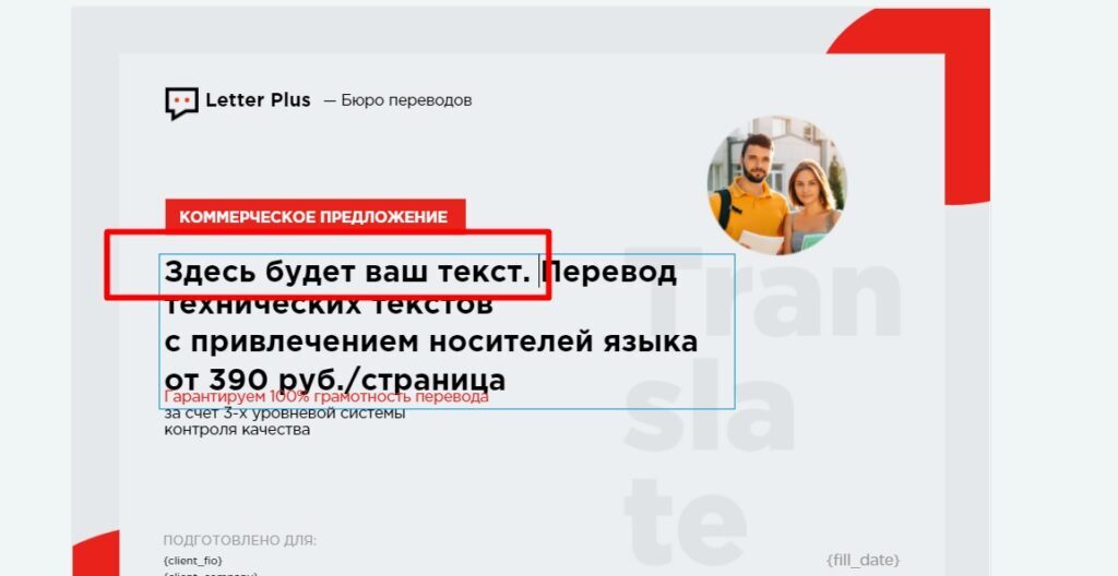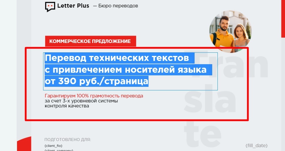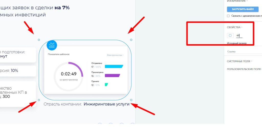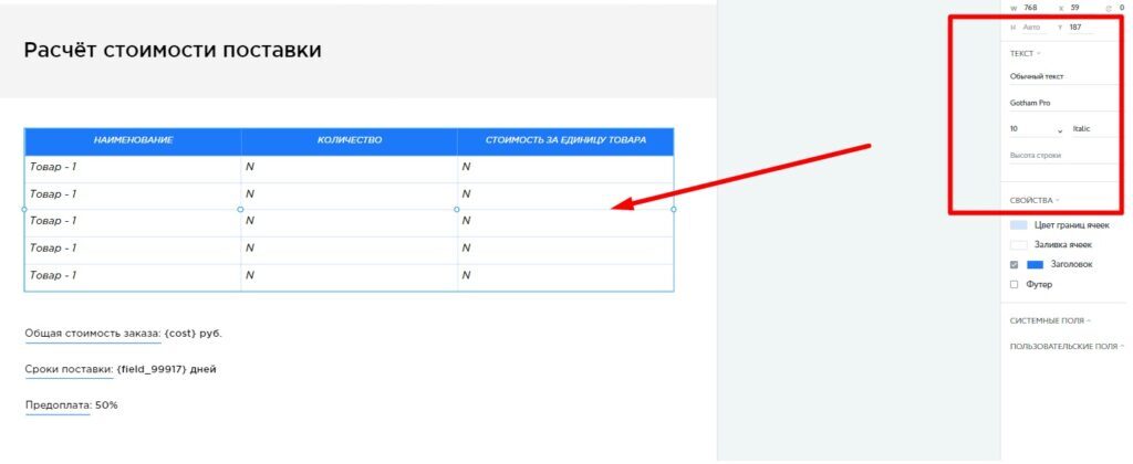 Системные поля позволяют автоматически подгружать в коммерческое предложение данные, хранящиеся в сервисе — дату, данные клиента, название предложения. А когда возникает необходимость отредактировать данные в КП под конкретного клиента — изображение товара или адрес — используются пользовательские поля.