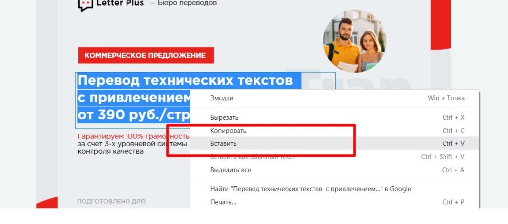 Затем вставьте свой текст (скопированный из блокнота или MS Word) через кнопку Вставить или «Ctrl+V».