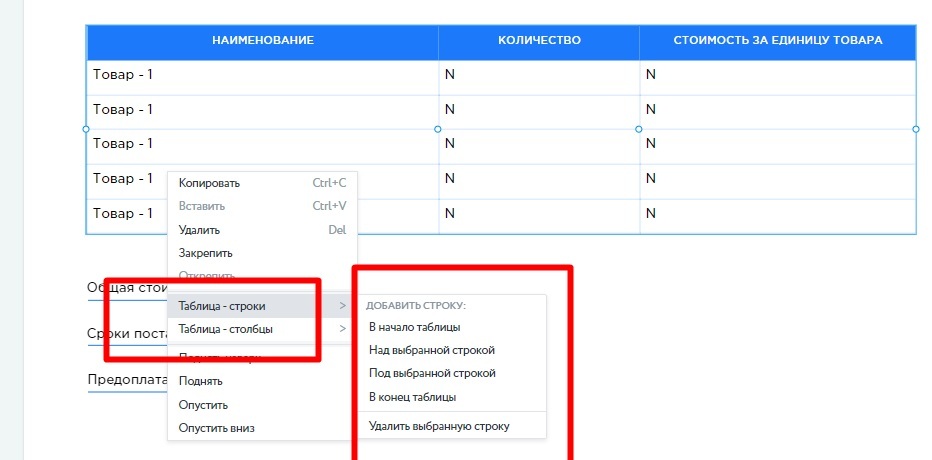 Вы можете добавлять и удалять строки. Для этого кликните по таблице 1 раз левой кнопкой мыши в том месте, где планируются изменения. Нажмите правую кнопку мыши. Далее выберите пункт — Таблица-строки или Таблица-столбы — и необходимое действие.