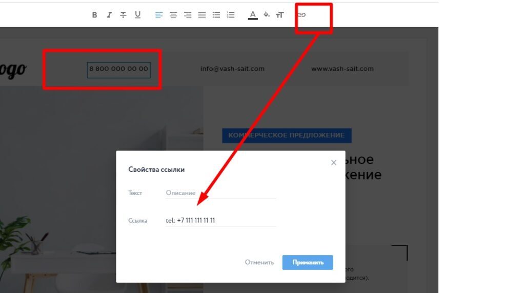 Чтобы сделать телефон кликабельным, нажмите на текст 2 раза левой кнопкой мыши, выберите значок ссылки в верхнем меню, введите ссылку в формате: «tel: номер телефона». Затем нажмите Применить.
