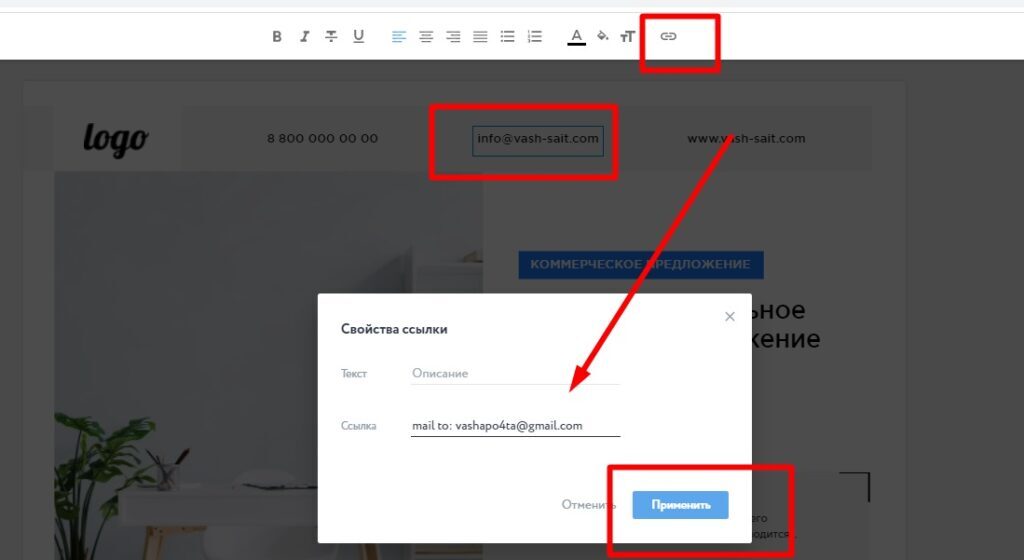 Чтобы сделать почту кликабельной, нажмите на текст 2 раза левой кнопкой мыши, выберите значок ссылки в верхнем меню, введите ссылку в формате: «mail to: ваша почта». Далее нажмите Применить.