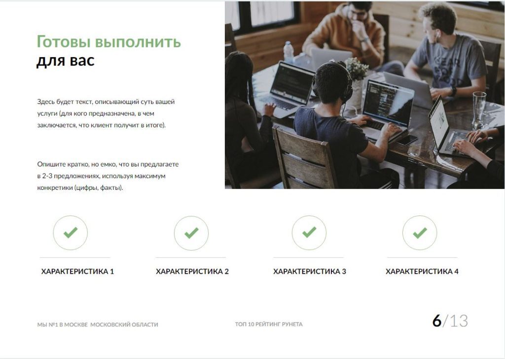 Разместите 1-2 лаконичных абзаца, раскрывающих характеристики Вашей услуги, используя максимум конкретики. Определите 3-4 ключевых особенности, которые отстраивают Ваше УТП от предложений конкурентов. Для наглядности разместите их в виде отдельных буллетов (абзацев) с лаконичными заголовками.