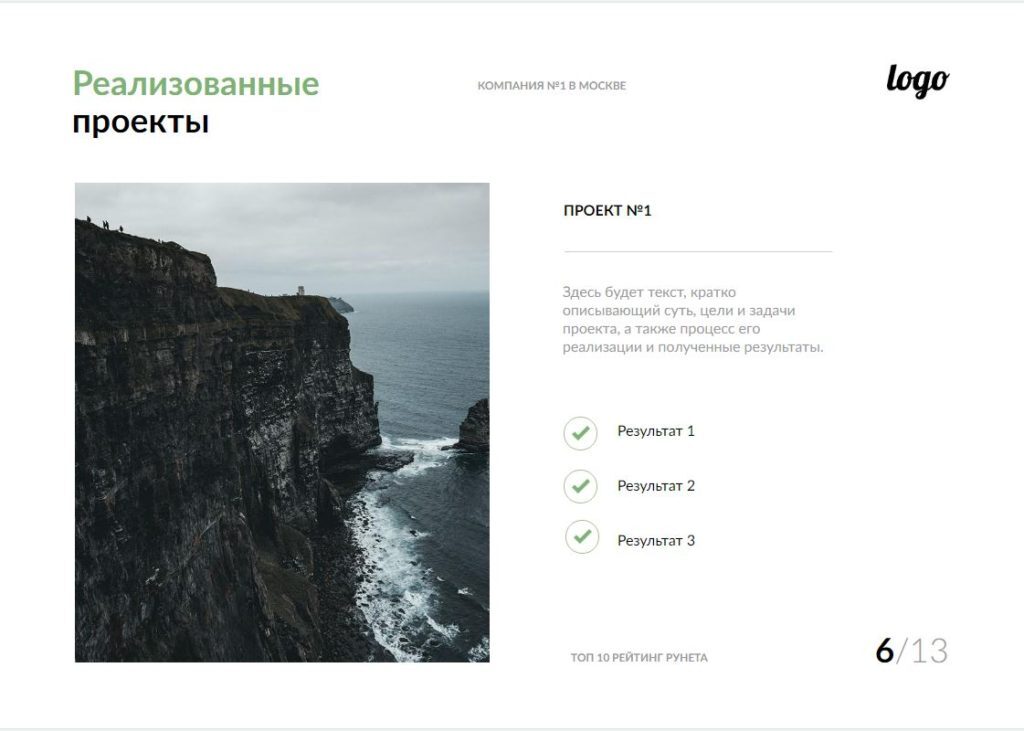 Опишите реализованные проекты, покажите клиенту конечные результаты на примере реальных кейсов. Предоставьте максимум конкретики по каждому проекту: заказчик, место реализации, количество привлеченных сотрудников, перечень выполненных работ, результаты и пр. Таким образом, Вы развеете возможные сомнения заказчика и повысите его лояльность. Дополнительным преимуществом станут отзывы и благодарственные письма, оформленные в виде сканов.
