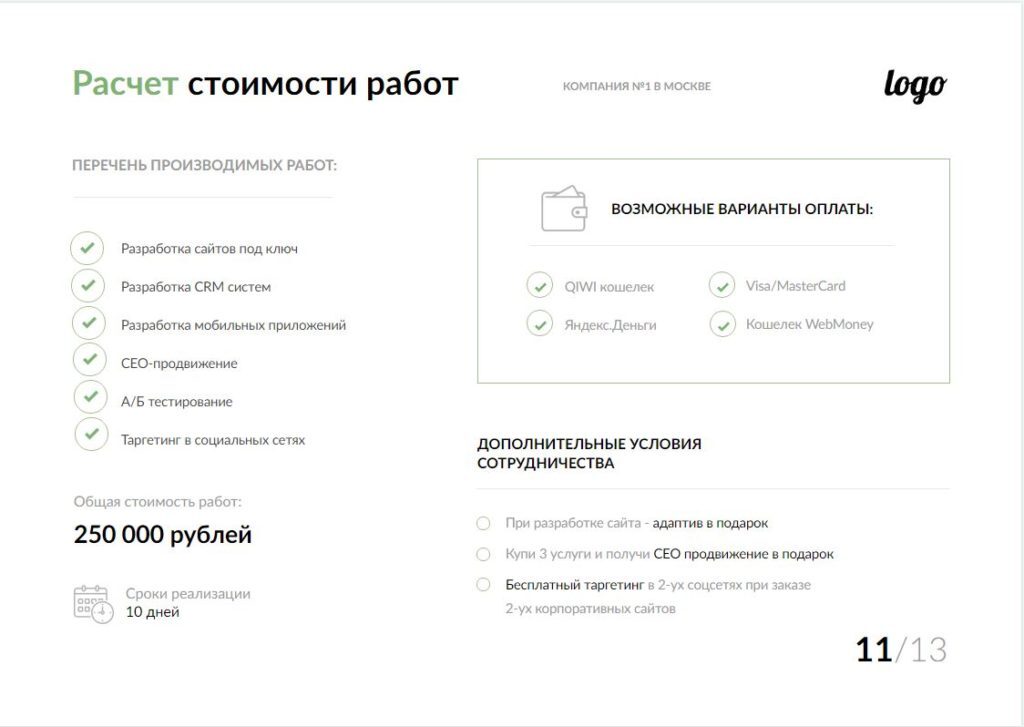 - По возможности, укажите сроки и стоимость каждого этапа;