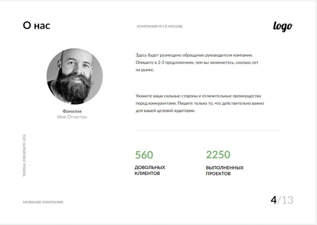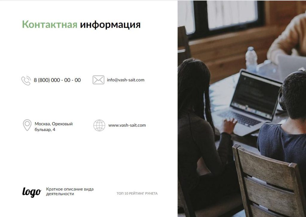 - Логотип, краткое описание вида деятельности;