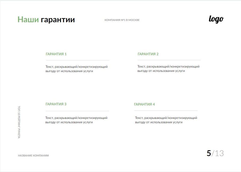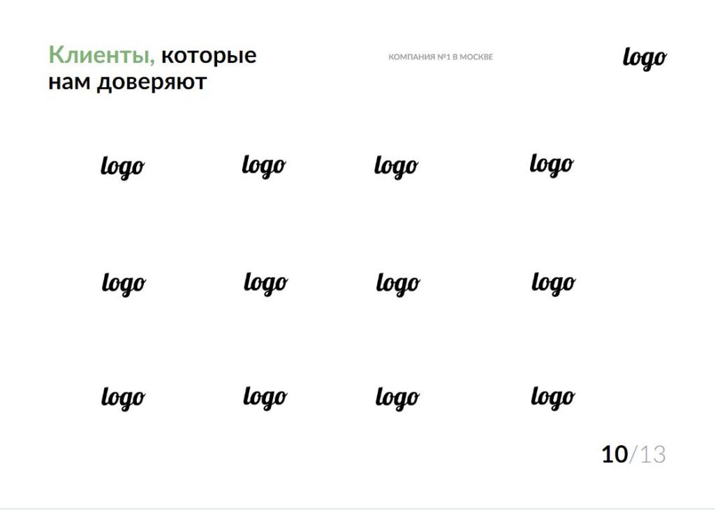 Для повышения лояльности потенциальных заказчиков разместите в КП логотипы текущих клиентов. Особенно это актуально при первом контакте, когда важно создать доверительный образ компании, а также в том случае, если среди Ваших заказчиков есть крупные игроки рынка. При отправке КП клиенту, с которым Вы уже сотрудничаете продолжительное время, этот блок можно не использовать.