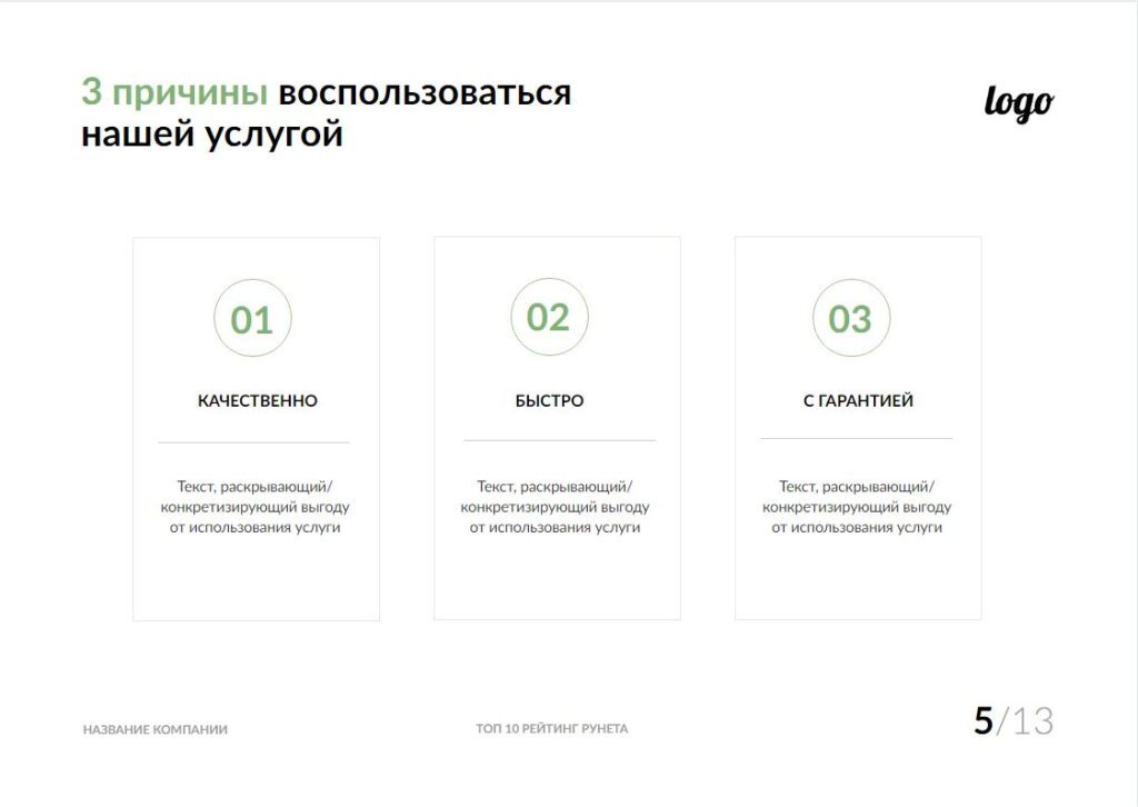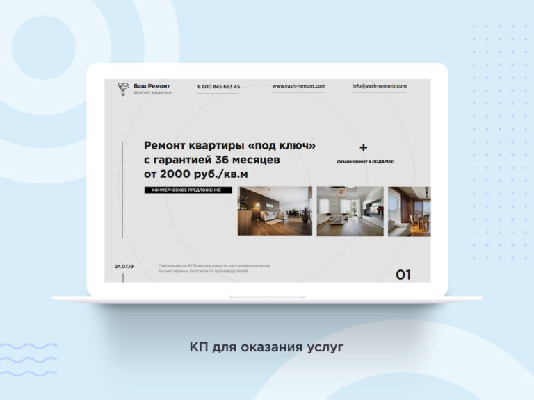 Титульная страница — первое, что видит клиент, поэтому чрезвычайно важно сделать ее максимально информативной. У вас есть всего несколько секунд, чтобы привлечь внимание клиента и вызвать интерес. Для этого в КП используется цепляющий Заголовок.