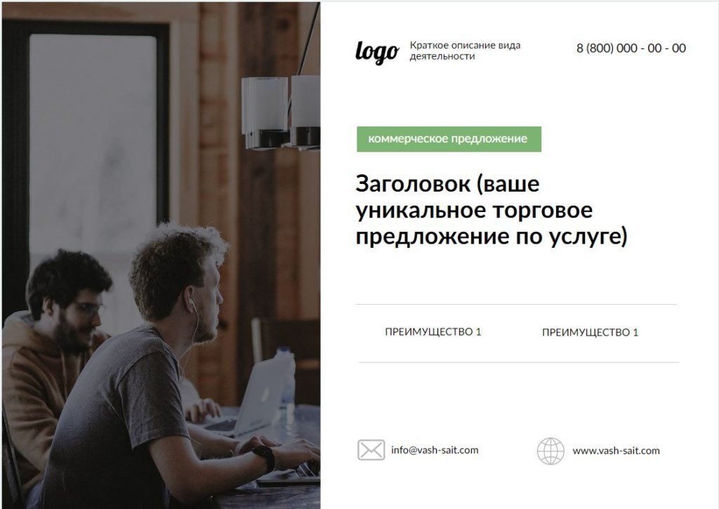 Для этого в коммерческом предложении должны быть предусмотрены специальные блоки, которые поэтапно вовлекают в процесс продажи. Структура продающего КП схожа со структурой посадочной страницы (лендинга). Они работают по схожему принципу. Рассмотрим образец общего КП на услуги, который можно адаптировать под любую сферу бизнеса.