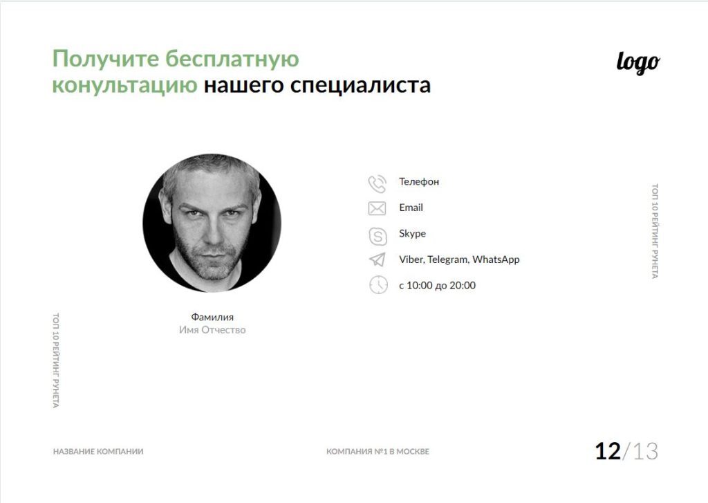 Помните, что люди покупают у людей. Чтобы Ваше КП не казалось безликим, добавьте страницу с контактными данными персонального менеджера клиента. По возможности используйте реальное фото, укажите оптимальное время и доступные варианты связи (телефон, почта, мессенджеры).