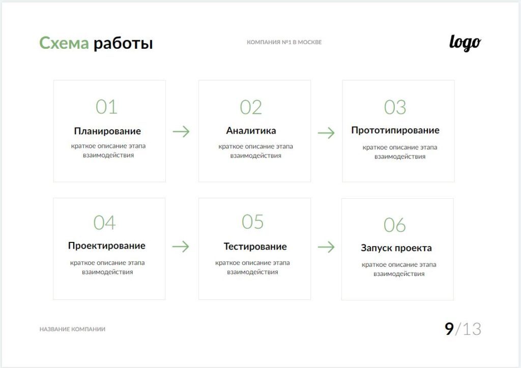 При составлении схемы работы используйте максимум конкретики и по возможности пропишите сроки реализации. Избегайте развернутого описания процессов, иначе клиент может потерять интерес. Достаточно разместить подзаголовок и 1 предложение, характеризующее суть процесса.