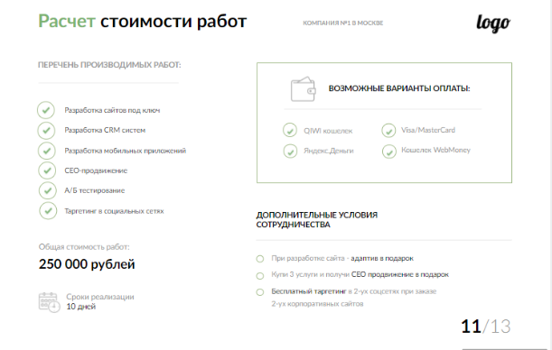 После того, как клиент «влюбился» в картинку, включается рациональное мышление. Ключевую роль играют стоимость и сроки проекта. При этом важно, чтобы прайс-лист КП отражал не только цену, но и ценность вашего предложения.